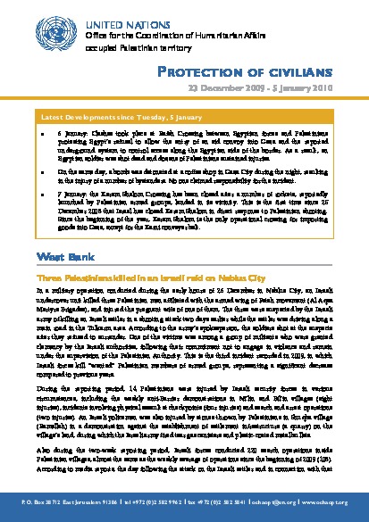 During the two-week period, eight Palestinians killed and 16 others injured by Israeli forces throughout the OPT. Settler-related incidents continue; one settler killed and 15 Palestinians and six settlers injured. Demolitions in Area C of the West Bank. Ban on Palestinian use of a main road (443) declared unlawful. Significant movement obstacle removed in Hebron area. In Gaza, Death toll from H1N1 reaches 18. One Palestinian died in a tunnel collapse. Glass allowed into Gaza for the first time since June 2007. Limited opening of Rafah and Erez Crossings. Nahal Oz Crossing shut down.