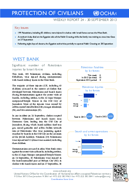 199 Palestinians, including 83 children, were injured in clashes with Israeli forces across the West Bank. A newborn baby died on the Egyptian side of the Rafah Crossing, while the family was waiting to cross into Gaza on 27 September. Following eight days of closure, the Egyptian authorities partially re-opened Rafah Crossing on 28 September.