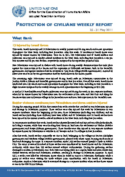 Israeli forces injure 13 Palestinians in the West Bank, including East Jerusalem. Also in the West Bank, settler violence continues; two Palestinians and two settlers injured. 14 structures demolished in Area C and East Jerusalem. A calm week in Gaza. Restrictions on imports and exports continue. Cooking gas shortages continue. Relaxation measures announced at Rafah Crossing. A man sentenced to death.