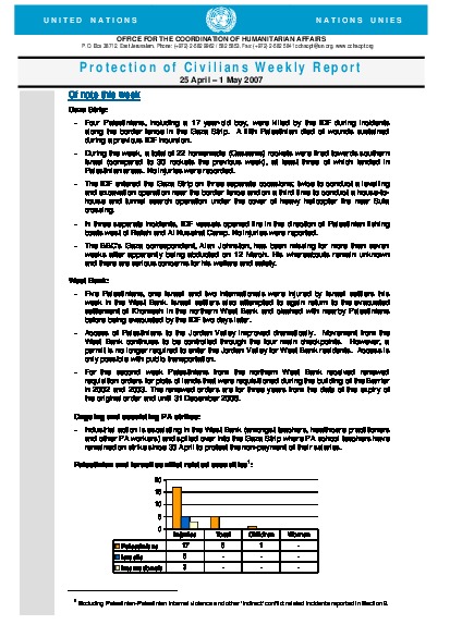 Four Palestinians, including a 17 year-old boy, were killed by the IDF during incidents along the border fence in the Gaza Strip. 22 homemade rockets were fired towards southern Israel, at least three of which landed in Palestinian areas. In three separate incidents, IDF vessels opened fire in the direction of Palestinian fishing boats west of Rafah and Al Nuseirat Camp. Access of Palestinians to the Jordan Valley improved dramatically.
