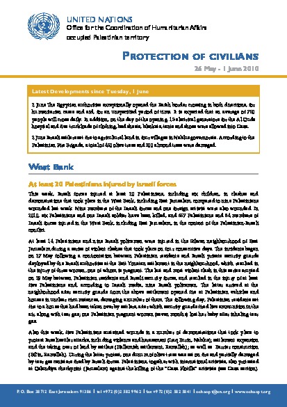 Ships carrying aid to Gaza intercepted; at least nine international activists killed. In the West Bank, at least 20 Palestinians injured. Israeli settler-related incidents continue. New easings on Palestinian movement implemented. Additional people at risk of displacement in Area C. In Gaza, violence escalates: five Palestinians killed and 39 injured. National NGOs closed down by Hamas. Tunnels continue to claim lives; seven fatalities and 14 injuries. Increase in imports; entry of building materials for two projects continued. Imports of industrial fuel and cooking gas remain below estimated needs.