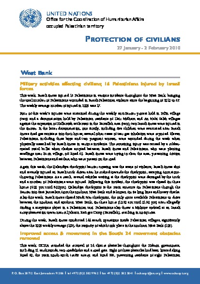 This week, Israeli forces killed one Palestinian (Gaza) and injured 20 others throughout the OPT. In the West Bank, Israeli forces removed 24 movement obstacles in the south. Israeli settlers take over a house in the Old City of Jerusalem; there were other settler-related incidents. A new wave of demolition orders in the West Bank. In Gaza, access restrictions on fishing areas continue. Tunnels continue to claim lives; two Palestinians died. Internal attacks result in two injuries. Electricity crisis continues despite slight improvement. Limited shipments of exports and entry of glass continue. Phase one of the new Northern Sewage Treatment Plant completed. Cooking gas.