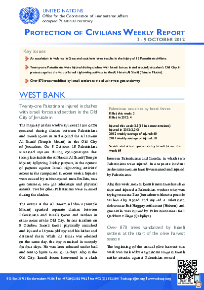 Israeli forces kill a Palestinian in the Gaza Strip and injure 39 other Palestinians throughout the OPT. In the West Bank, settlers injure three Palestinians and damage over 870 trees at the start of the olive season. No demolitions recorded for the fifth consecutive week. Also in the Gaza Strip, frequent power cuts continue.