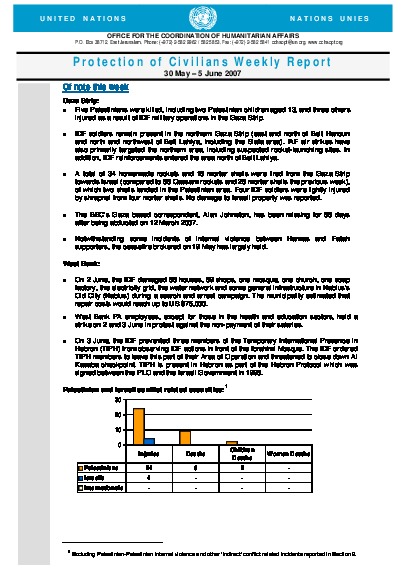 Five Palestinians were killed, including two Palestinian children aged 13, and three others injured as a result of IDF military operations in the Gaza Strip. IDF soldiers remain present in the northern Gaza Strip. 34 homemade rockets and 16 mortar shells were fired from the Gaza Strip towards Israel. The IDF prevented three members of the Temporary International Presence in Hebron (TIPH) from observing IDF actions in front of the Ibrahimi Mosque.