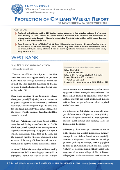 One Palestinian armed militant was killed and five others injured in Gaza. In the WB, number of Palestinians injured was roughly 35% higher than ave number of Palestinians injured/wk since the beginning of 2011. 22 Palestinian structures were demolished in E Jlm and Area C of the West Bank. 120 essential medicines and 140 items of medical supplies are completely out of stock in Gaza. Exports of come crops from Gaza allowed to international markets, but still prohibited to Israeli and West Bank markets.
