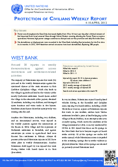 Israeli forces injure 36 Palestinians throughout the OPT. In the West Bank, collapse of "fabric of life" road results in long detour for Ramallah area residents. No demolitions reported. In Gaza, three Palestinian men executed by the Gaza authorities. Three children injured by UXOs. Electricity provision remains unstable, disrupting delivery of vital services and daily lives of 1.6 million people. Cooking gas shortages continue.
