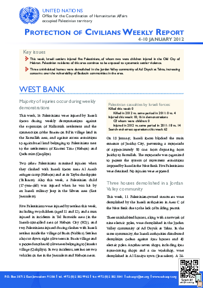 This week, Israeli forces injure 18 Palestinians and settlers injure another five in the West Bank. Three houses were demolished in a Jordan Valley community. Access to the herding community of Khan al Ahmar blocked. In Gaza, a worker was killed and another injured while inside a tunnel. Supplies for critical patients enough for more than a month were received. Limited agricultural produce leaves Gaza.