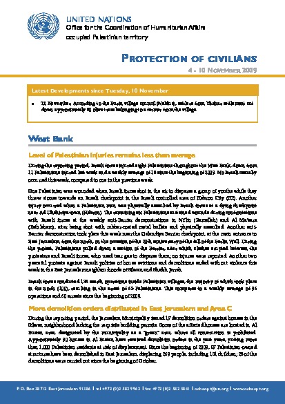 This week, ten Palestinians sustained wounds by Israeli forces throughout the OPT; eight in the West Bank and two in Gaza. More demolition orders distributed in East Jerusalem and Area C; 17 in Silwan and four in Nablus. There were 15 reported settler-related incidents this week. Al Jalama checkpoint is opened to vehicles of Palestinian citizens of Israel for the first time in eight years. In Gaza, Humanitarian agencies call for an immediate opening of crossings before winter. Around 60 percent of households are food insecure. A significant reduction in amounts of cooking gas and industrial fuel that entered this week. Imports remain below average needs.
