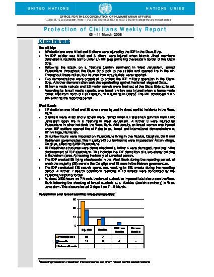 6 Palestinians were killed and 5 others were injured by the IDF in the Gaza Strip. One Palestinian was killed and 23 others were injured in direct conflict incidents in the West Bank.8 Israelis were killed and 9 others were injured when a Palestinian gunman from East Jerusalem open fire in a Yeshiva in West Jerusalem. 65 curfew hours were imposed on Palestinians living in the Nablus, Qalqiliya, Salfit and Bethlehem governorates. The majority (42 curfew hours) were imposed on ‘Azzun village, Qalqiliya, affecting 8,262 Palestinians. 29 Palestinian structures were demolished and a further 4 were damaged, resulting in the displacement of 73 Palestinians.