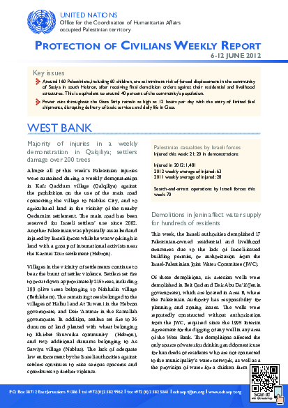 Israeli forces injure 23 Palestinians throughout the OPT. In the West Bank, settlers damage over 200 trees, primarily olive trees. Water supply for hundreds of residents affected by demolitions in Jenin. Around 4 percent of Susiya residents at risk of immediate displacement. Access for Palestinian Fire Brigades exacerbate damages. In Gaza one killed and another injured in a tunnel-related incident. Fuel ciris continues amid entry of limited fuel supplies.
