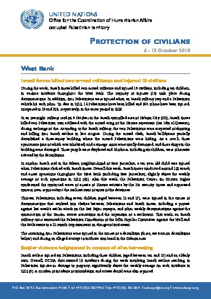 Israeli forces killed two Palestinians and injured 30 others throughout the West Bank, including East Jerusalem; another six Palestinians injured by settlers. In the West Bank, settler violence heightened during olive harvesting. Demolitions and stop-work orders continue. In Gaza, Israeli air strikes and access restrictions continue. Imports increased, however restrictions on entry of building materials and the almost total ban on exports remain in place. Despite increase in fuel imports, electricity production remains below needs.