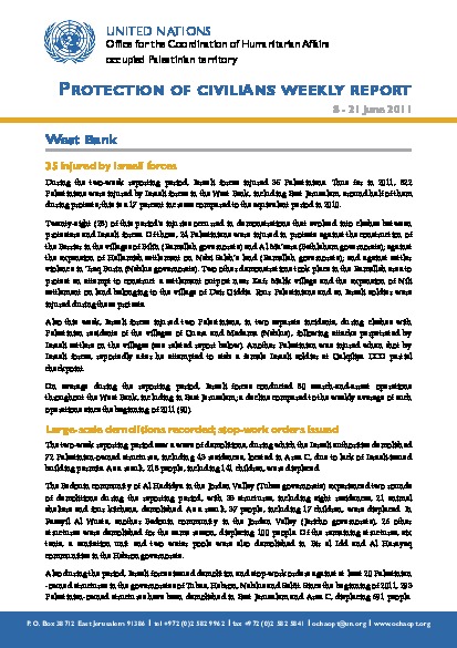 During the two-week reporting period, Israeli forces injured 35 Palestinians throughout the West Bank. Also in the West Bank, 72 structures demolished, displacing over 200 people. Settler violence continues. An update on access and Barrier. In Gaza, a Palestinian injured by a rocket and another killed in a tunnel-related incident. Restrictions on movement of Gazans through Rafah continue; thousands struggle to travel. Improvements in electricity supply continue. Restrictions on imports and cooking gas shortages continue. Shortages of medical supplies continue to impact provision of services.