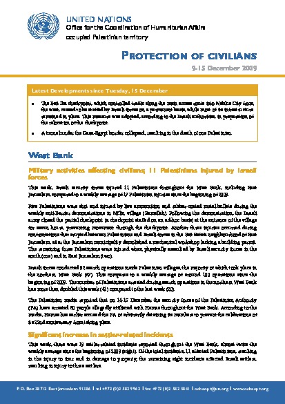 This week, Israeli forces killed one Palestinian near the Gaza-Israel border (Gaza) and injured 11 others (West Bank). There is a significant increase in settler-related incidents, in which four Palestinians injured. Main Nablus-Jenin road closed off. New report on Area C released. In Gaza, NGOs targeted. UNRWA hand over the first temporary shelter. Scheduled rolling blackouts throughout Gaza reach up to 32 hours. Death toll of H1N1 reaches nine in Gaza. The Israeli Court upholds ban on visits to Gazan prisoners. Despite increase in cooking gas supply, shortages continue. Weekly average of imported truckloads remain below needs.