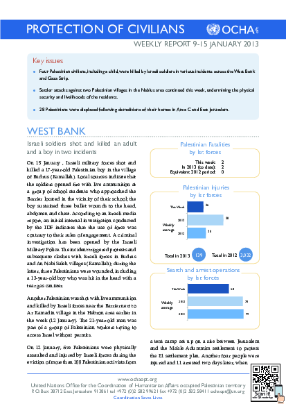 Four Palestinian civilians, including a child, were killed by Israeli soldiers in various incidents across the West Bank and Gaza Strip. Settler attacks against two Palestinian villages in the Nablus area continued this week, undermining the physical security and livelihoods of the residents.  28 Palestinians were displaced following demolitions of their homes in Area C and East Jerusalem.