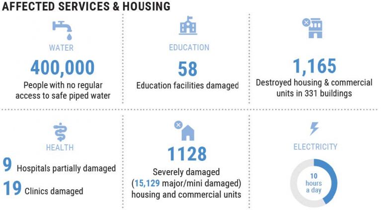 Repairs are ongoing, but damage to basic infrastructure and utilities is limiting the provision of electricity and piped water.