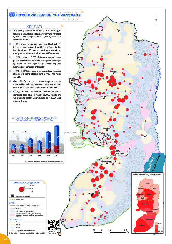 The weekly average of settler attacks resulting in Palestinian casualties and property damage increased by 32% in 2011 compared to 2010, and by over 144% compared to 2009