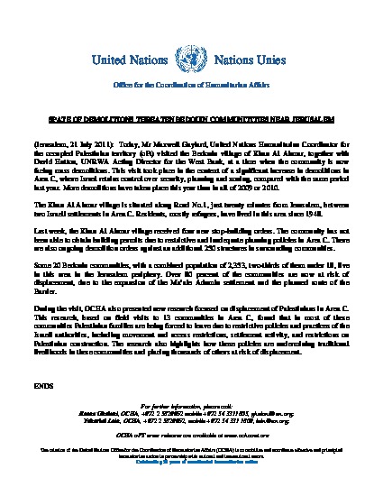 (Jerusalem, 21 July 2011): Today, Mr Maxwell Gaylard, United Nations Humanitarian Coordinator for the occupied Palestinian territory (OPT) visited the Bedouin village of Khan Al Ahmar, together with David Hutton, UNRWA Acting Director for the West Bank, at a time when the community is now facing mass demolitions. This visit took place in the context of a significant increase in demolitions in Area C, where Israel retains control over security, planning and zoning, compared with the same period last year. More demolitions have taken place this year than in all of 2009 or 2010.