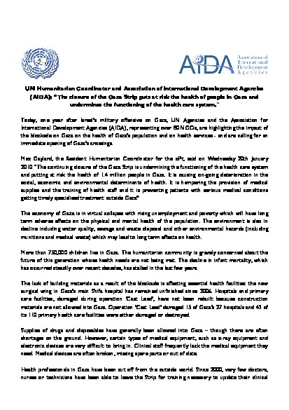 Highlighting the impact of the blockade on Gaza on the health of Gazas population and on health services, the UN HC and AIDA call for an immediate opening of the crossings. "The closure of the Gaza Strip puts at risk the health of people in Gaza and undermines the functioning of the health care system.