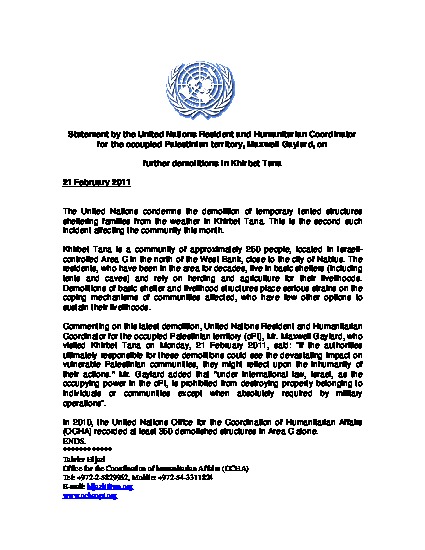 Statement by the United Nations Resident and Humanitarian Coordinator on Further Demolitions in Khirbet Tana