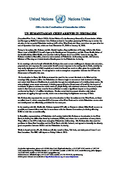 United Nations Under-Secretary-General for Humanitarian Affairs and Emergency Relief Coordinator John Holmes arrived in Jerusalem yesterday 28 February to review the situation in the occupied Palestinian territory (OPT) of the West Bank and Gaza, more than one year after the end of Operation Cast Lead, which ran from December 27, 2008 to January 18, 2009. While in Israel and the OPT, Mr. Holmes will also travel to Gaza, Tel Aviv, and visit parts of Area C and East Jerusalem. The ERC will depart on Friday 5 March 2010.