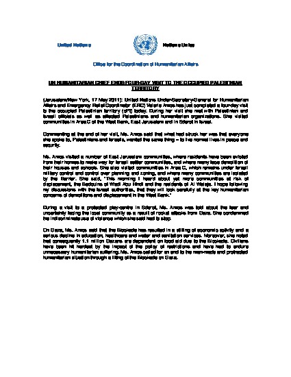 (Jerusalem/New York, 17 May 2011): United Nations Under-Secretary-General for Humanitarian Affairs and Emergency Relief Coordinator (ERC) Valerie Amos has just completed a four-day visit to the occupied Palestinian territory (oPt) today.