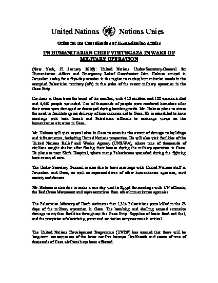 (New York, 21 January 2009): United Nations Under-Secretary-General for Humanitarian Affairs and Emergency Relief Coordinator John Holmes arrived in Jerusalem today for a five-day mission in the region to review humanitarian needs in the occupied Palestinian territory (oPt) in the wake of the recent military operation in the Gaza Strip.