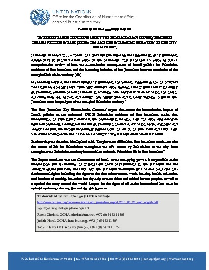 UN REPORT RAISES CONCERNS ABOUT THE HUMANITARIAN CONSEQUENCES OF ISRAELI POLICIES IN EAST JERUSALEM AND THE INCREASING ISOLATION OF THE CITY FROM THE OPT