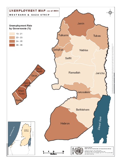 Unemployment in the oPt. Map showing unemployment by governorate as of 2004. Map prepared for the cap 2006