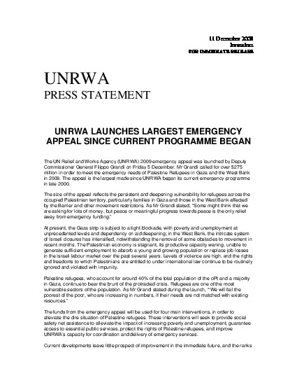 The UN Relief and Works Agency (UNRWA) 2009 emergency appeal was launched by Deputy Commissioner General Filippo Grandi on Friday 5 December. Mr Grandi called for over $275 million in order to meet the emergency needs of Palestine Refugees in Gaza and the West Bank in 2009. The appeal is the largest made since UNRWA began its current emergency programme in late 2000.
