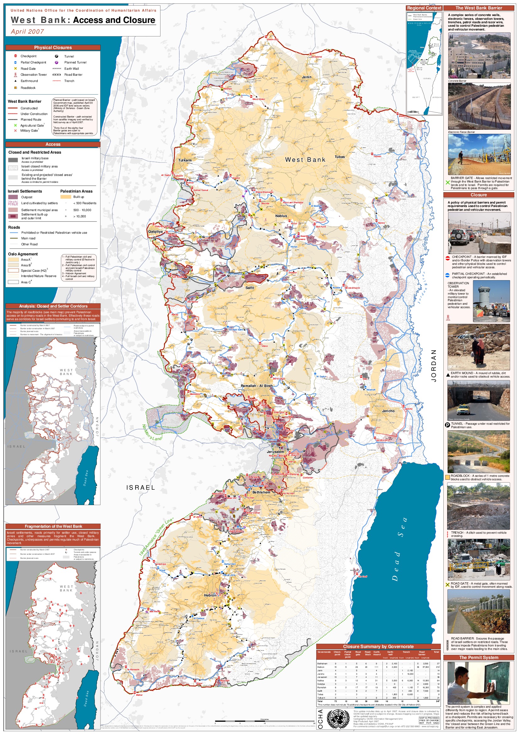 Updated closure map: Checkpoints, road barriers, trenches, closure count, barrier route and settlements April 2007