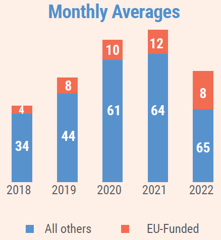 Thirteen (13) of the structures, all located in Area C communities, had been provided as humanitarian aid, including ten funded by the EU or its Member States, at a value of 33,337 euros. These included three residential structures in two herder communities in southern Hebron. Another thirteen (13) structures funded by the EU or its Member States, at a value of 113,847 euros, received stop-work or demolition orders. Additionally, dozens of trees and saplings provided by the EU were reportedly vandalized by settlers ahead of the olive harvest season, which started in the West Bank on 13 October.