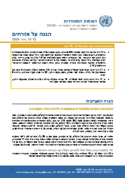 Intra-Palestinian violence increased in the southern West Bank Governorates of Hebron and Bethlehem this week. Eight Palestinians, including three children, were injured by Israeli forces in the West Bank in various types of incidents. Huwwara checkpoint is now open for all Nablus city residents to enter and exit Nablus without permits, and most infrastructure at the Jericho DCO checkpoint at the southern entrance to Jericho City was removed. Two Palestinian families demolished adjoining structures to their homes in the Old City of Jerusalem. The Jerusalem municipality, distributed 20 demolition orders in Al Bustan neighborhood of Silwan in East Jerusalem. On 15 June, Israeli military forces, accompanied by representatives of the Israeli Civil Administration, issued orders to a farmer from Khirbet Tuwayil, in the Nablus Governorate, east of 'Aqraba village, for the immediate removal of two structures, First cases of H1N1 flu reported in the West Bank.