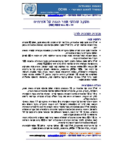 Demonstrations were held throughout the Gaza Strip and West Bank to commemorate the 60th anniversary of what Palestinians refer to as Al Nakba. At least 16 Israelis were injured when a rocket struck a shopping center in the city of Ashkelon in southern Israel. The closure imposed on the West Bank since 6 May continued until 17 May.
