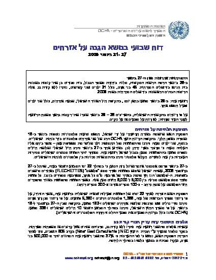 The cease-fire unilaterally implemented by Israel, Hamas, and other Palestinian factions since 18 January is partially holding. Tens thousands of Gazans remain homeless, with most staying with relatives or other host families. Gaza water and sanitation conditions, which had severely deteriorated during the Israeli offensive, have somewhat improved. As a whole, the population of Gaza is receiving approximately 84% of its electricity needs. NGOs continued to face difficulty accessing the Gaza Strip to carryout humanitarian work. The higher numbers of truckloads entering Gaza since 28 December 2008 continued during the reporting period. Protests against the Barrier and the Israeli Gaza offensive continued in the West Bank villages of Ni'lin, Bil'in (Ramallah), Jayyus (Qalqiliya) and Ma'sara (Bethlehem). In northern West Bank, Israeli authorities renewed the orders issued for requisitioning the land on which the Barrier was built.
