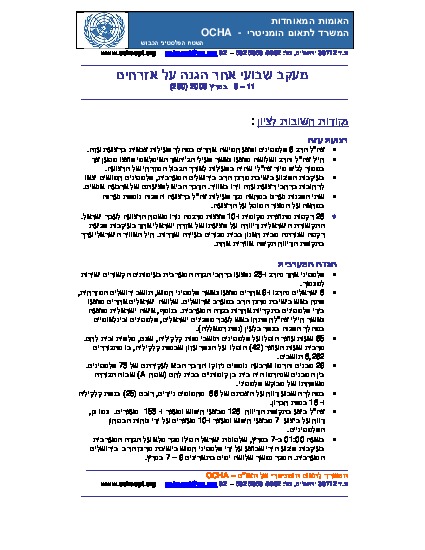 6 Palestinians were killed and 5 others were injured by the IDF in the Gaza Strip. One Palestinian was killed and 23 others were injured in direct conflict incidents in the West Bank.8 Israelis were killed and 9 others were injured when a Palestinian gunman from East Jerusalem open fire in a Yeshiva in West Jerusalem. 65 curfew hours were imposed on Palestinians living in the Nablus, Qalqiliya, Salfit and Bethlehem governorates. The majority (42 curfew hours) were imposed on ‘Azzun village, Qalqiliya, affecting 8,262 Palestinians. 29 Palestinian structures were demolished and a further 4 were damaged, resulting in the displacement of 73 Palestinians.