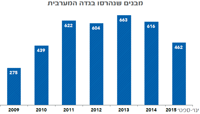 בין ינואר לספטמבר 2015 נהרסו בסך הכול 462 מבנים בבעלות פלסטינית, נתון זהה כמעט לנתון בתקופה המקבילה ב־2014. מספר בני האדם שנעקרו כתוצאה מהריסות (525) פחת ב־45% לעומת 2014. נתונים אלה משקפים את ההתמקדות הגוברת בשנת 2015 במבנים הקשורים במחיה (כגון מחסים לבעלי חיים, מחסנים, בורות מים, דוכנים מסחריים) ולא במבני מגורים.