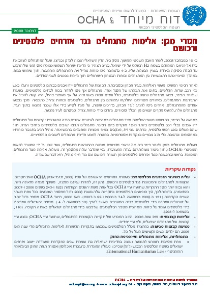 In the first 10 months of 2008, OCHA recorded 290 settler-related incidents targeting Palestinians and their property. This figure reflects a worrying trend, since it surpasses the total recorded by OCHA in each of the previous two years. Similarly, Palestinian deaths and injuries resulting from settler-related incidents in 2008 exceed the number of Palestinian casualties in each of the previous two years. Approximately half of all Palestinian injuries from settler violence each year since 2006 have been made up of children, women, and the elderly over 70 years of age.